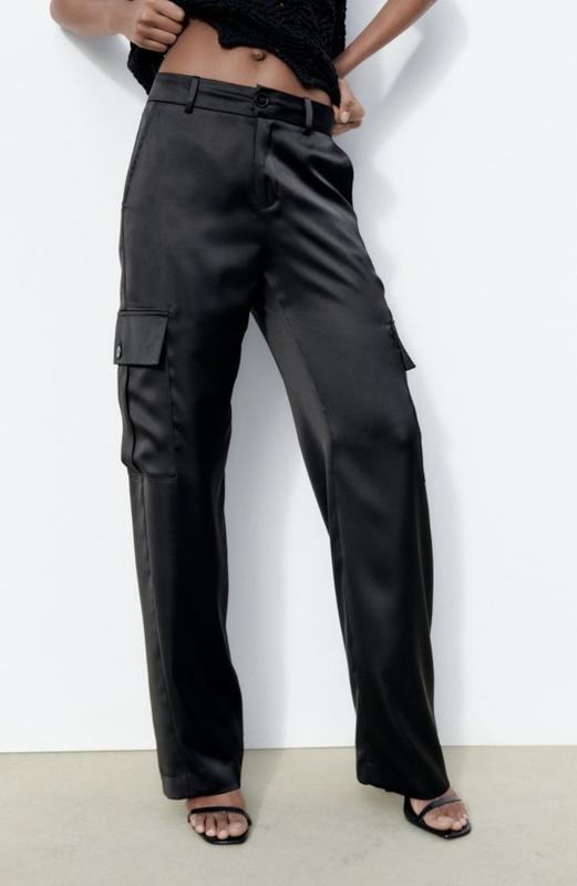 Брюки фасона карго от Zara, материал - атлас/сатин. Длина 109 см, пояс 40 см, бедра 48 см, посадка 29/44 см, ширина штанины внизу 24 см. Без дефектов