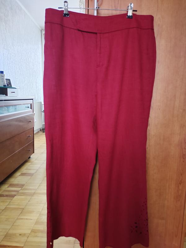 Отличные летние брюки! Лен 100% качественная ткань плотного плетения, держит силуэт. Ажурные элементы по низу штанин - привлекательный декор! Насыщенный цвет, красно- бордовый. Размер 40/L Все замеры на фото Состояние новый!