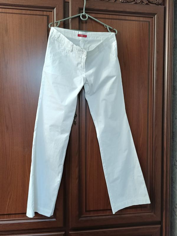 радикально белые, посадка удобная, на бедрах, немножко до низа расширены. длина боковая 103, внутри 83, талия 86. малые)