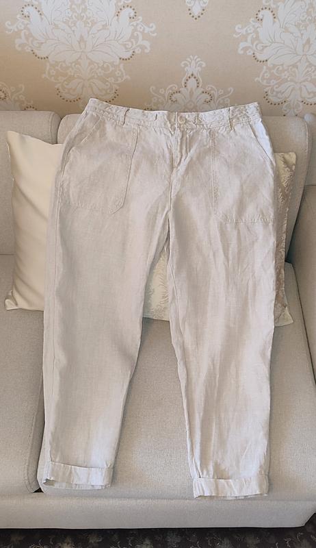 чудові лляні штанці, у кольорі бежево-сірий. розмір євро 42, Америка 10, Англія 14. заміри 👇🏼 довжина 90, на зріст до 167. якщо Вище на зріст вже як ближче бріджі, або якщо любите щоб були підстрелені зараз модно щіколотки відкриті. довжина крокового шва всередині - 63 ширина штаньки внизу - 16 талія ширина напівобхват - 45-46 стегон напівобхват - 52-53 посадка: перед -30 позаду - 38