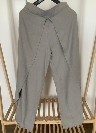 Льняні штани з запахом, без недоліків,ніжно оливковий колір, ззаду резинка. Довжина 90 см, в бедрах 52 см. Висока посадка. Відповідають розміру. Перед замовленням зв’язуйтесь зі мною.