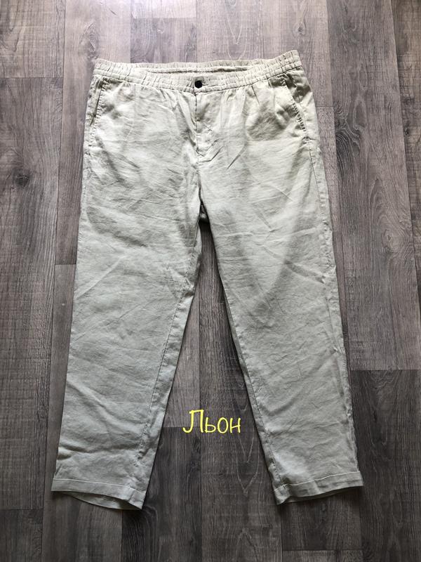 Довжина по зовнішньому шву 99, по внутрішньому 69, посадка 34/41, пот 51 (тягнеться до 55), зсередини є куліска, можна регулювати пояс. Поб 61. Ширина штанини зверху 35, коліно 27, знизу 21. Є запасні ґудзики. Склад: 50% льон, 50% бавовна. Стан нової речі