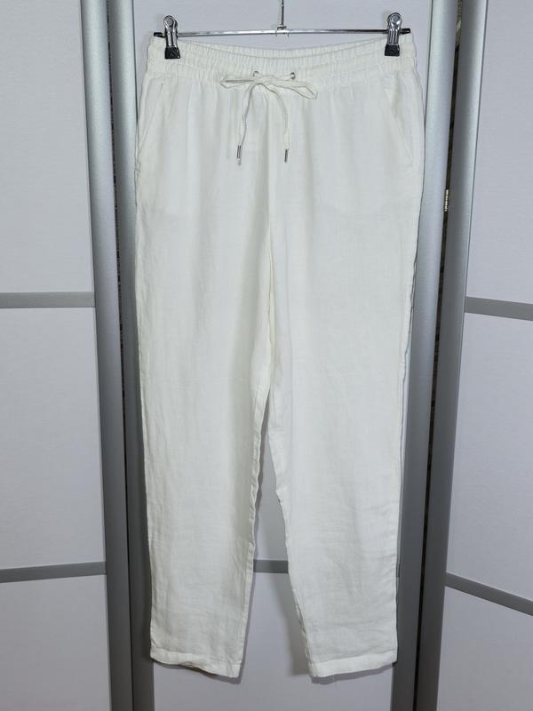 H&M белые льняные брюки Сверху широкая резинка и шнурок, по бокам карманы Бирка со сбором срезанная, 100% лен, качественный Идеальное состояние Размер не натуральный, на S длина-97 длина шагового шва-71 полу охват в талии-37-44 стегон-48 полу охват брючины верх/низ-31/15,5 посадка спереди/сзади-31/39 Возвращение не предусмотрено
