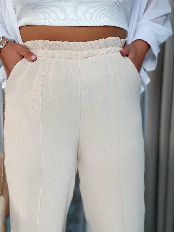 🩵Штани літо 💎💎💎 🤍Модель: 1323 🤍Ціна: 590 грн 🤍Розміри: 50-52,54-56, 58-60 🤍Тканина: американський креп-жатка 🤍Колір: чорний , бежевий ,шоколад, оливка Стильні штани з карманами, висока посадка, на резинці .Трендовий фасон , легка текстура. Чудовий вибір на жарке літо Виміри Об - 122см/ 132 см / 142 Довжина - 101 см , 104 см , 107 см.севе