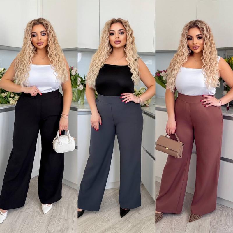 Брюки палаццо🆕🆕🆕 #1436 Розміри ☑️ 48-52,54-58,60-64 Висока зручна посадка, ззаду на резинці, збоку кармани Сідають ідеально 😍 Тканина👉 турецька креп костюмка 👌Гарної якості 👍 Кольори 👉чорний, графіт, капучино Заміри: 48-52. 54-58. 60-64 Об 128. 134 146 От 88-110. 100-120. 120-132 Дов. 111. 112 113 Увага ‼️ тканина не стрейчева Тому розміри повномірні і ззаду є резинка щоб було зручно 🤗 На моделі 48-52 Параметри 108 90 112 Зріст 168 см