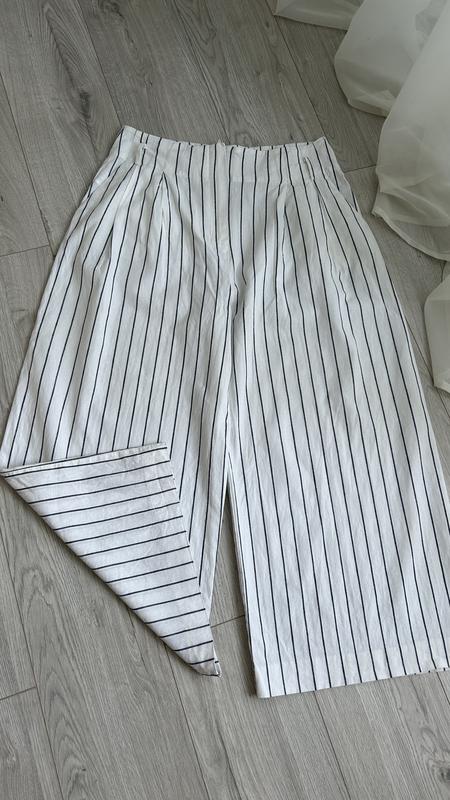 Широкі брюки кюлоти з льону та бавовни, стильні та надзвичайно гарні. Посадка висока, полоска вертикальна, візуально витягує силует. Довж 100, пот 46, поб 67, посадка 40, ширина штанини 40. Без дефектів, стан ідеальний.