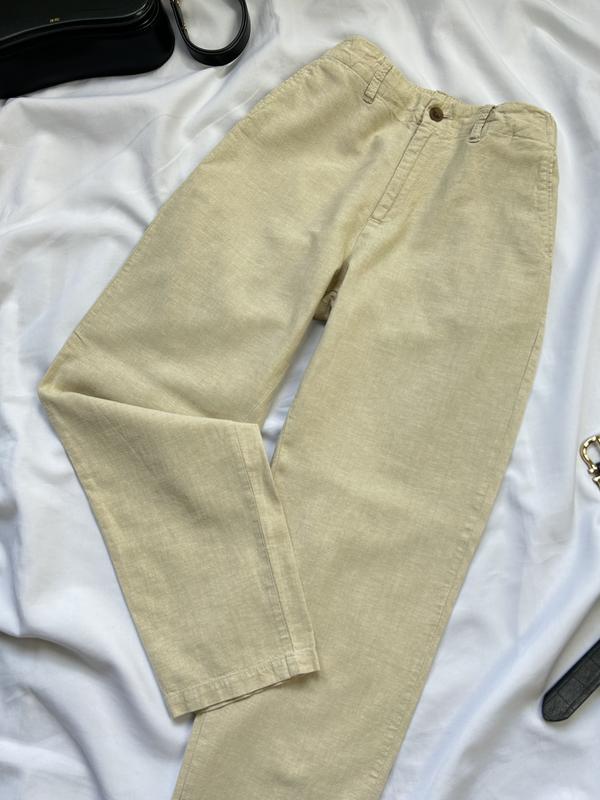 Якісні брюки на високій посадці,склад льон та віскоза,стан нової речі Напів обхват талії 36(позаду є резинка),напів обхват стегон 51,висота посадки 27/38,довжина внутрішнього шва 70, довжина виробу 94