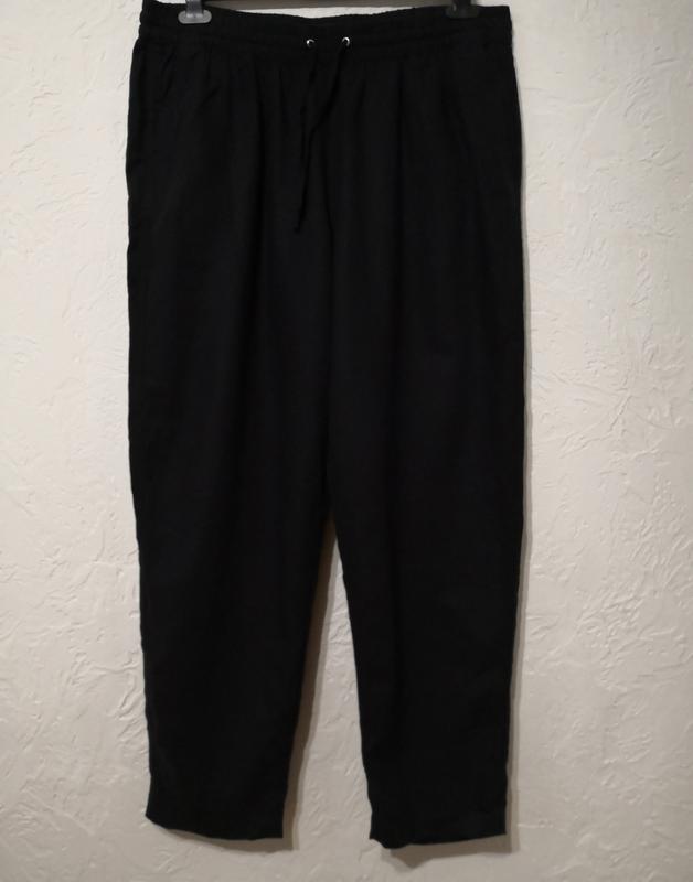 Легкие зауженные брюки из вискозно-лляной ткани - идеальный выбор для лета. Модель с карманами, резинкой на талии и шнурком из той же ткани для дополнительной регулировки. Замеры: ПОТ-44 (57) ПОБ-63 Посадка-39 Длина шерсть.шва-102 Довжина внутр.шва-71