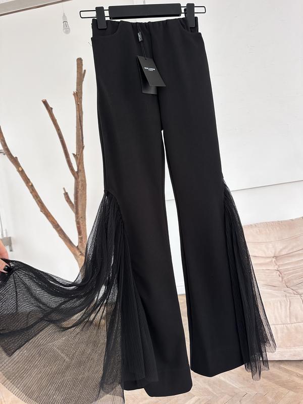 Стильні чорні брюки з акцентними вставками з плісированого фатину по боках. Модель з еластичним поясом забезпечує комфортну посадку, а прозорі шифонові деталі додають образу вишуканості та легкого драматизму. Ідеальний варіант для вечірніх виходів, стильних фотосесій або модних подій.