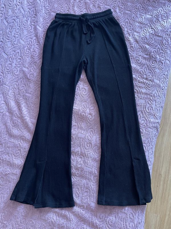 Штани кльош в рубчик, знизу розрізи попереду, тканина мʼяка і добре тягнеться , пояс резинка 34см, тянуться до 39см, бедра 48см, тянуться до 54см, довжина 103см