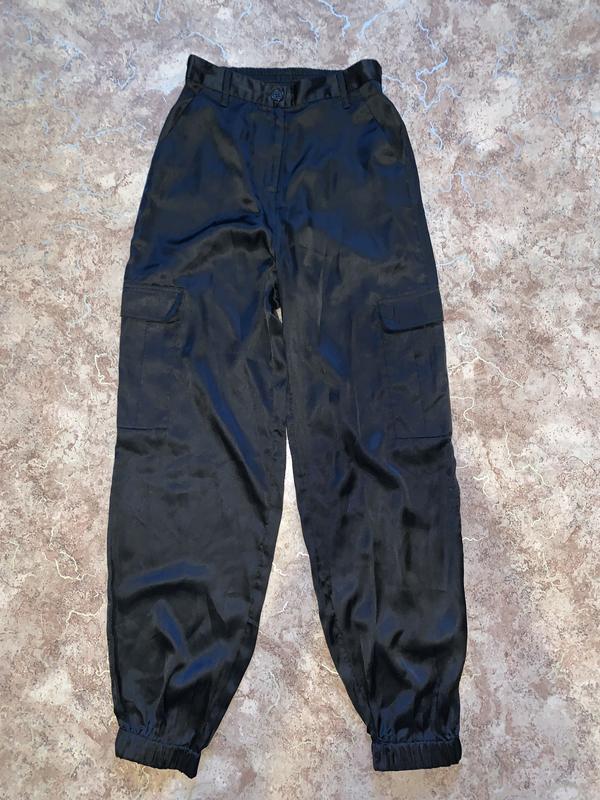 Атласні штани карго, чорного кольору, дуже легкі, приємні до тіла, з трендовими кишенями, низ на резинці. Заміри питайте в особисті 💌