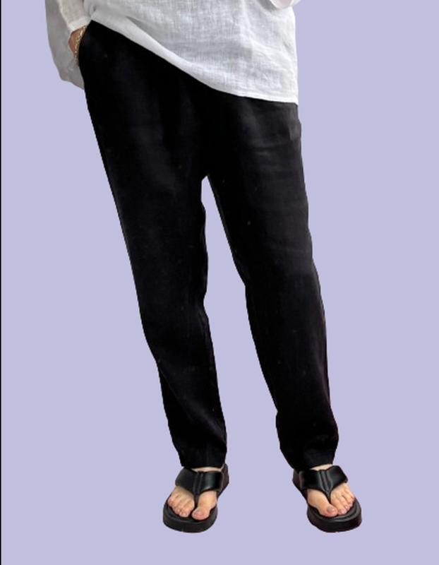 Чорні льняні брюки жіночі H&M Європейський розмір М, на 46-48 Пояс 42 (тянется до 50), бедра 59, довжина по боковому шву 104,5, по внутрішньому 77, висота сидіння ззаду 36, спереду 34,5, ширина штанини вгорі 33,5, внизу 18 Склад: на фото. Без паперової етикетки. Купляла собі - промах з розміром🤷♀️