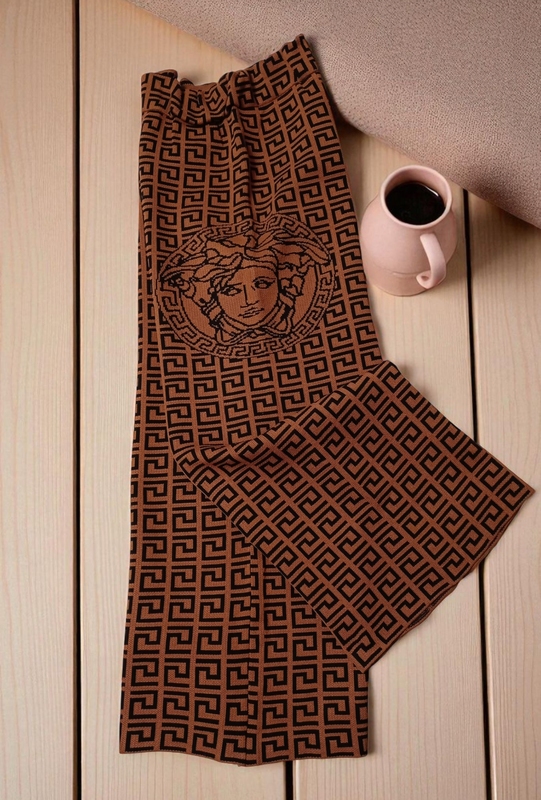 Брюки украшены повторяющимся геометрическим узором и крупными изображениями головы Медузы, являющейся знаковым символом бренда Versace. Брюки машинной вязки, широкие, плотные, теплые. В поясе резинка. Глубокая посадка. Цвет коричневый с черным узором. Какие - либо бирки отсутствуют. Качество пошива и трикотажа отменное! Идут на 46/48 размер. ✔️ ПОТ 36/45 ✔️ ПОБ 51/59 ✔️ посадка переда 35 ✔️ шаговая длина 61 ✔️ длина 87 ✔️ ширина штанины внизу 30 Состояние новых.