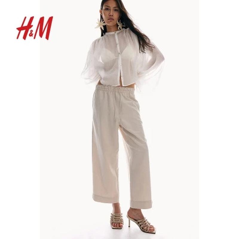 Широкие укороченные брюки из смеси льна, хлопка и вискозы H&M p S, состояние идеально Длина 93 Крок 65 Пот 35 резинка до 43 Поб 58 Ширина штанини 34/29 Посадка 31/44