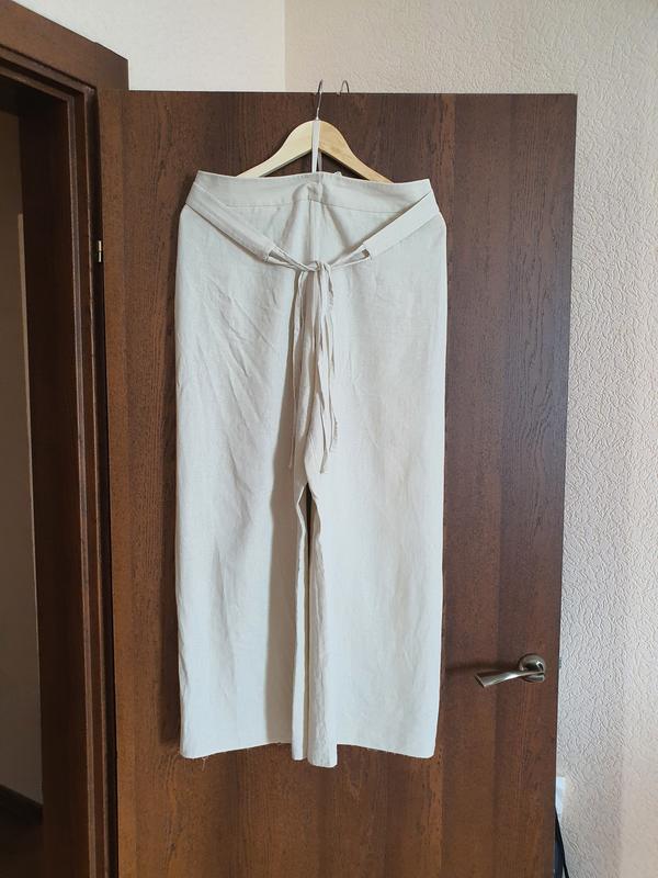 Удобные на комфортные льняные брюки прямого кроя с интересными декоративными завязками на поясе. Обращайтесь для уточнения деталей.