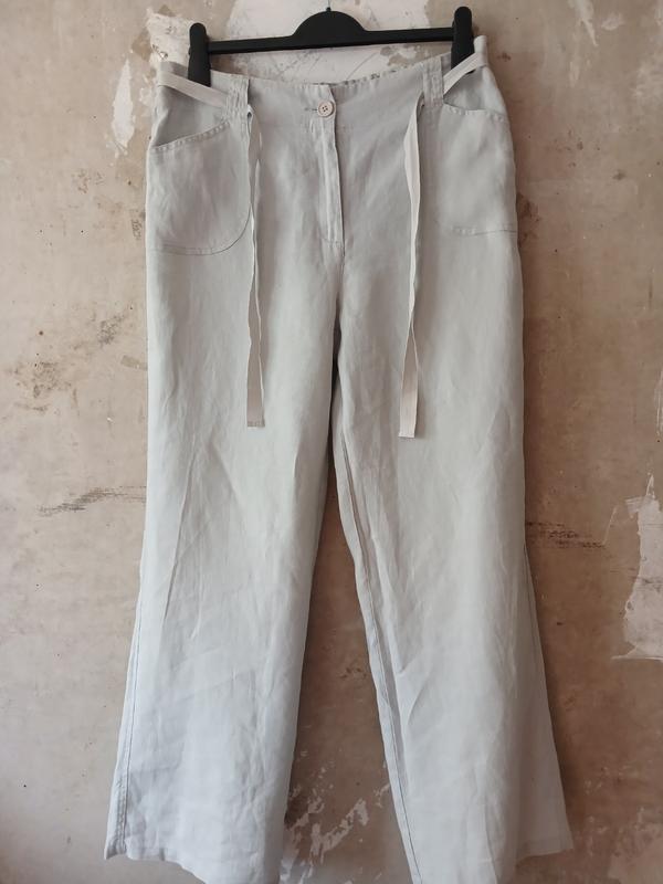 Льняные брюки от Cotton Traders Изготовлены из 100% натурального льна Цвет - нежный бледно-серый Широкие брюки от бедра до низа. Высокая посадка с эластичным поясом на резинке для комфортной посадки без давления. Удобные накладные карманы на бедрах Центральная застежка на одну маленькую перламутровую кнопку и тонкий ремень (шнурок) для регулировки пояса. Чистый лен (100% Linen), мягкий и дышащий, с природной текстурой, Лен со временем становится только мягче, а серый оттенок не выцветает на солнце. Размер: UK 16 (соответствует примерно 46-48 размеру в украинской системе) Замеры: Талия полуобхват-44 см Талия в растянутом виде полуобхват -49 см Бедра полуобхват-52 см Длина по шерстяному шву штанины -100 см Длина по внутреннему шву штанины -73см Посадка спереду - 31см Посадка сзади-41см Ширина штанини внизу (напівобхват)-27 см Ширина штанины вверх(полуобхват)-34см Бренд Cotton Traders известен качественными натуральными тканями и британским акцентом на комфорт Новые, только без бумажной бирки