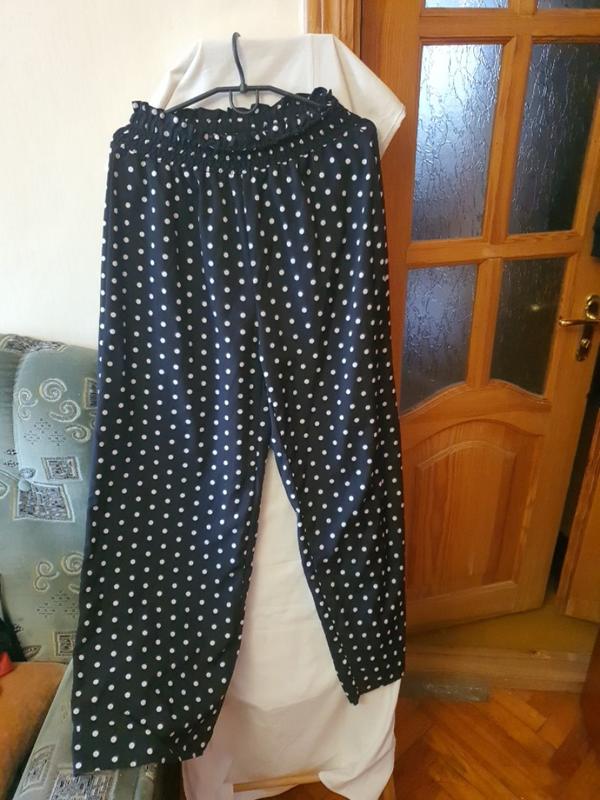 Брюки женские широкие как из искусственного шелка или вискозы, на резинке 33см, которая растягивается до 50см 33см ширина кашливы,105см длина, элегантные, красивые и очень удобные, классика-черные в белый горох