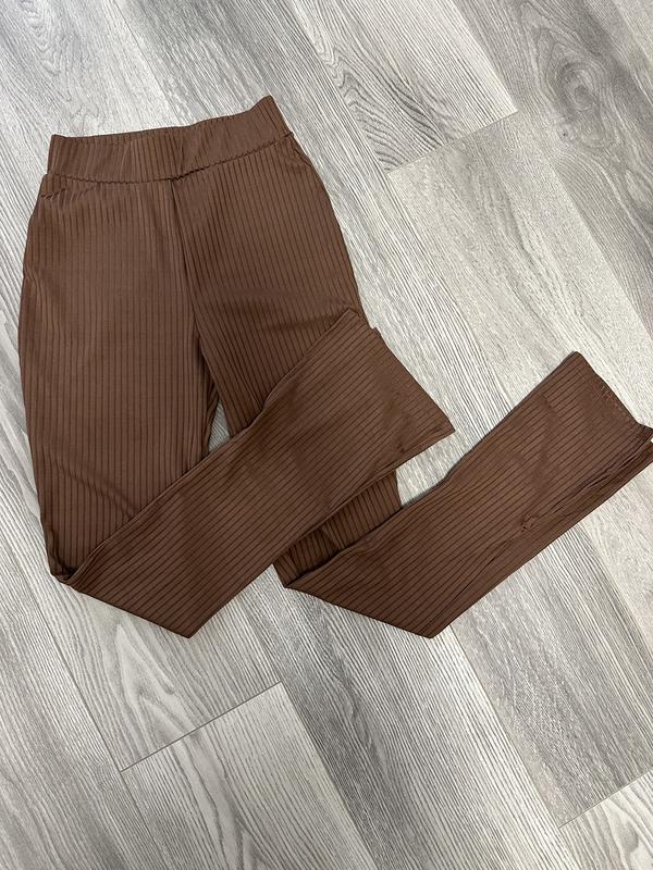 Брюки в рубчик, облягають зверху як лосини, знизу вільні зі стильними розрізами. Трендовий шоколадний колір 🤎тягнуться, на бірці вказано зріст 152-158