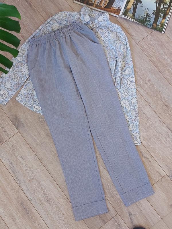 Брюки производство Украина. Полиэстер, бирки отсутствуют. С 2-мя карманами. Длина: 100, подшитые вручную, является запас 10см, можно сделать длиннее. ПОТ: 30, широкая резинка, хорошо тянутся на талию до 45 см. Посадка спереди 24, сзади 37 Ширина штанины сверху 25, снизу 18 На лето, теплую весну.