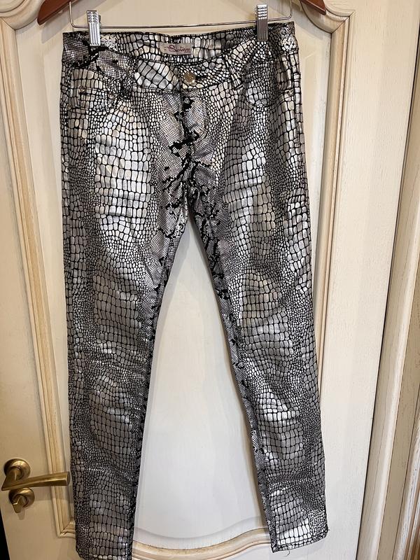 Стильні штани з напиленням сріблястого кольору з анімалістичним принтом, з бавовни-приємні до тіла, у складі є еластан, то ж трохи тягнуться але при цьому і досить плотні