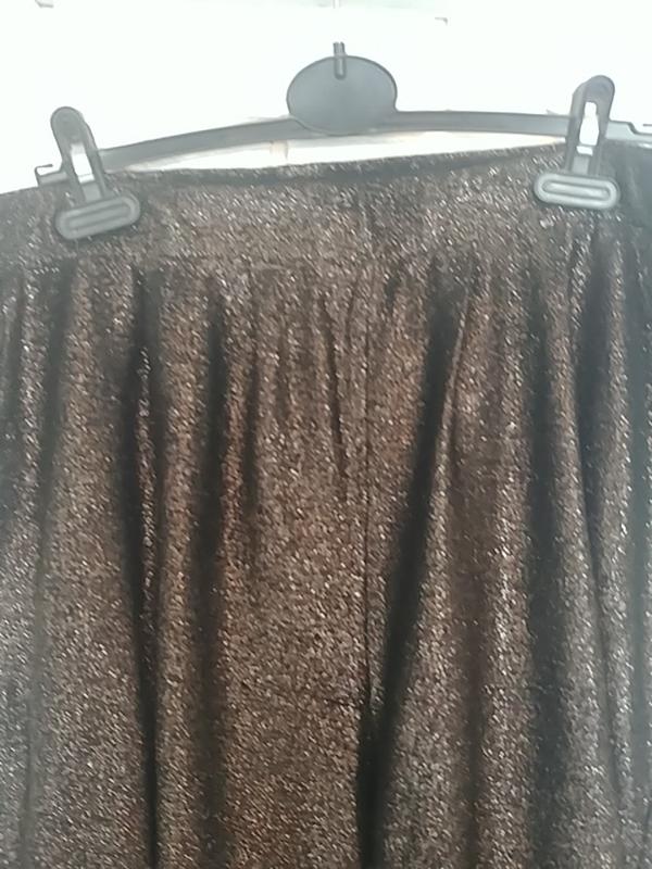 Брючки люрекс шикарные, легкие. Складки, карманы, модель мом.Есть немножко зацепы ( последнее фото) но вообще не заметны пот 51-58 поб 68 длина 110 ширина штанини верх 39, низ 18 посадка 40×44 трикотаж тянется
