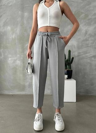 🏹Брюки укороченные ▪️Мод: 4141 ▪️Размеры: 42-44, 46-48 ▪️Тканина: двохнитка люкс ▪️Цвета: темно-серый, светло-серый, темно-синий, черный, шоколад 💬повседневные женские брюки с эластичным поясом, мягкая, легкая ткань трикотаж, понятная к телу, хорошо подходит для теплого сезона.Фасон:прямые, слегка заужены книзу, укороченные (до щиколотки).Посадка: высокая - акцентирует талию и добавляет комфорта.пояс: эластичный с резинкой и завязками для регулировки – удобно и функционально.Детали: декоративные защипы спереди создают имитацию классических брюк, добавляя структурированности образу.Кичины: боковые, удобные для повседневного использования.Идеально подходят для casual-луков, офисного стиля в неформальной атмосфере или комфортных городских прогулок. Хорошо сочетаются с кедами, майками, рубашками или джемперами😍 📎Длина 90см