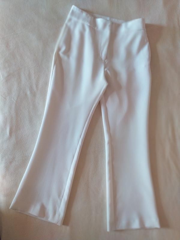 Белые брюки. Замеры: ПОТ- 38- 40см, ПОБ- 50см, длина - 95см, ширина штанины верх/низ - 28/23, посадка - 31/40.