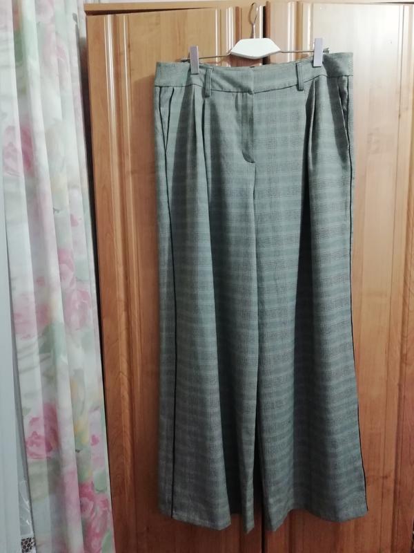 Трендовые брюки кюлоты в клетку. Посадка высокая. Пояс-100 Бедра-140 Длина-118 см. Ширина брючины пополам-39 см. 84% - полиэстр 12%- вискоза 4%- эластан.