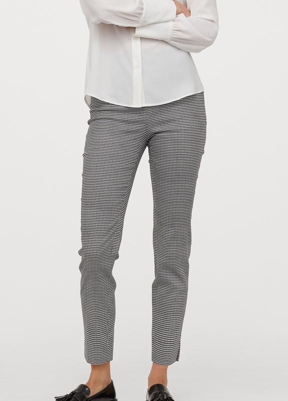 дуже гарні брюки в дрібні "гусині лапки" з блискавкою позаду і маленькими розрізиками на калошах внизу по бокам брюки за фасоном нагадують джинси мом, трохи укорочена довжина, розмір M/L