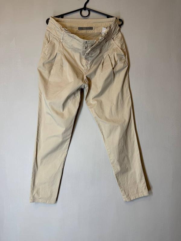 Эти светло-бежевые брюки от ZARA BASIC – универсальный вариант для базового гардероба. Изготовлены из 97% хлопка и 3% эластана, они мягкие, эластичные и хорошо держат форму. Модель имеет высокую посадку, застежку на несколько пуговиц, боковые карманы, пояс со шлевками и легкие складки у талии, придающие объем. Крой - прямой, слегка зауженный к низу, подходит как для офисного, так и для повседневного стиля. 🔍 На шве одной штанины присутствуют едва заметны потертости - дефект незначительный, не влияет на общий вид или комфорт. 📌 Характеристики: - Бренд: ZARA BASIC - Размер: S - Материал: 97% хлопок, 3% эластан - Цвет: светло-бежевый / песочный - Крой: прямой, слегка зауженный - Стан: красивый, с незначительным дефектом - потертость по шву - Страна производства: Марокко Также обратите внимание на мое другое объявления))
