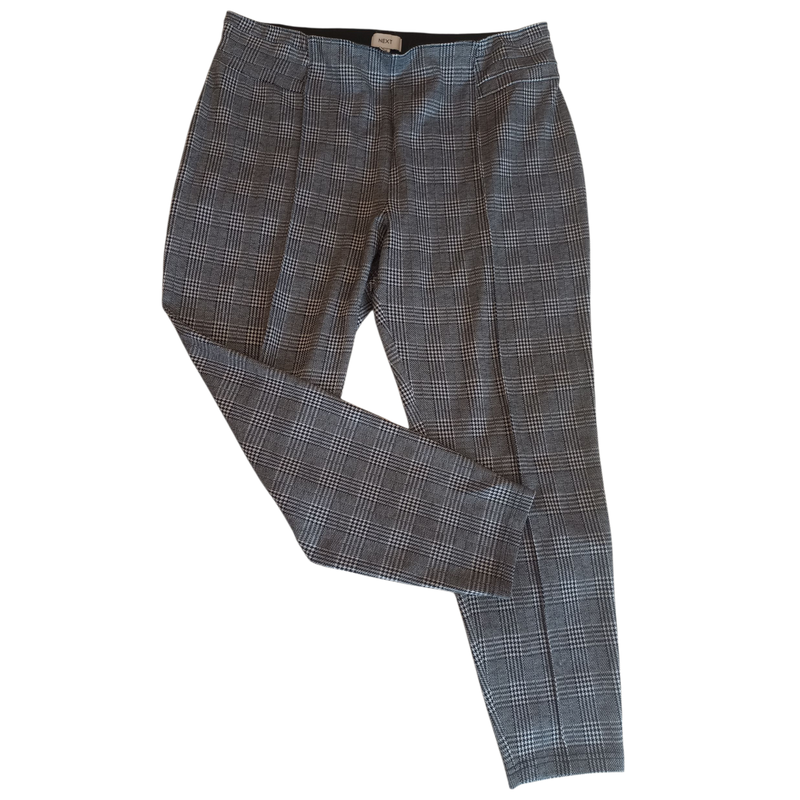 Тип: Женские брюки ( леггинсы или скинни). Цвет: Оттенки серого, с мелким черно-белым клетчатым узором (принт "принц Уэльский"). Детали: Визуально имеют стрелки, что придает им классический или офисный вид. Посадка:это модели с высокой посадкой. длина по боковому шву 100 см, внутренний шов 70 см полуобхват талии 50-60 см, бёдер 65-75 см полуобхват брючины вверху 30-40 см, внизу 14-18 см посадка перед 34 см, зад 46 см