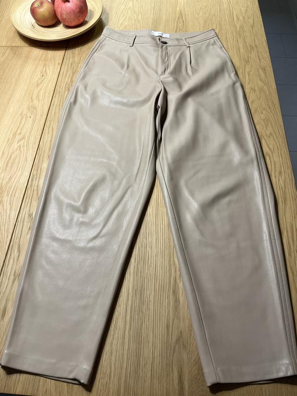 Брюки зі штучної шкіри ніжного бежево-пудрового кольору.