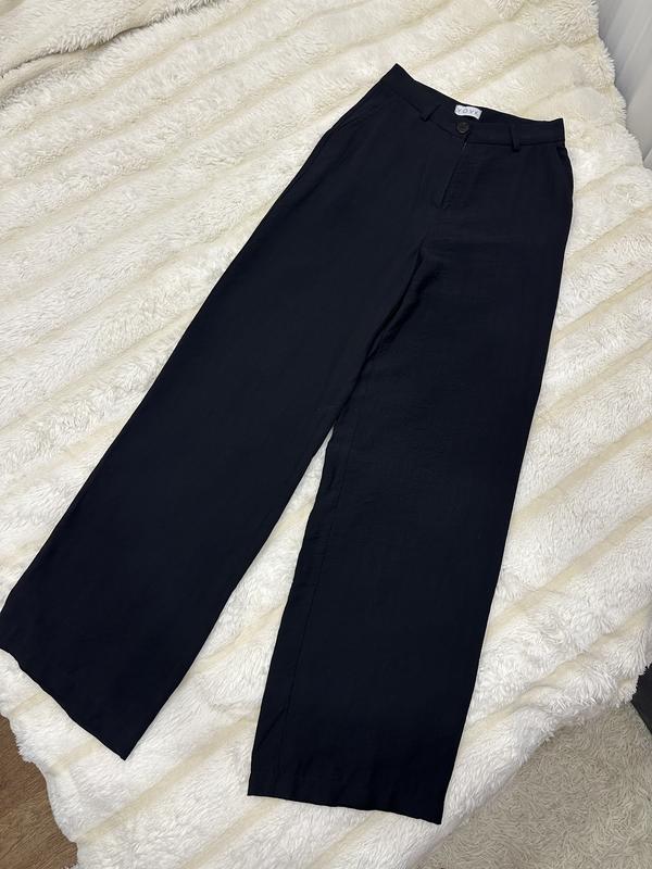 Нові лляні брюки прямого крою, (палацо) українського бренду VOVK. Розмір S, Дуже гарні і комфортні. Невагомі. Длина по бок шву 113, крок 84, пот 35, пос 49, ширина в ляжці 39, по низу 27. Бокові кишені. Фурнітура-ідеальна. Недоліків немає. Колір глибокий чорний, на фото засвічує.