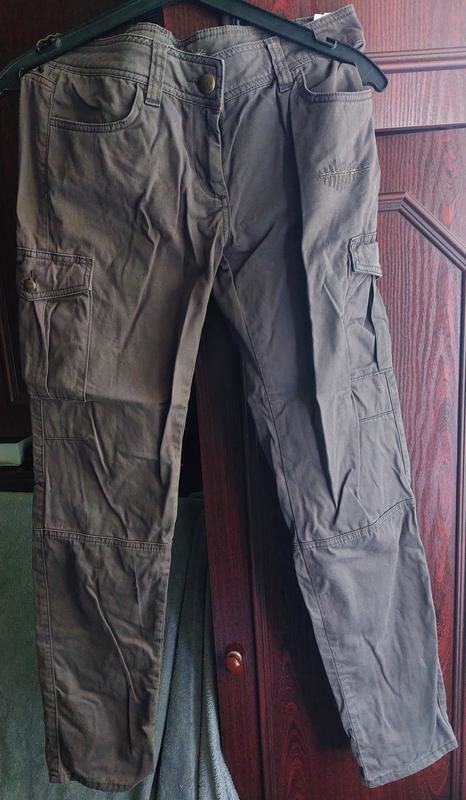 Брюки хаки бренда Cache Cache. Майже не тянуться. Состояние хорошее. Фиолетовый цвет у пуговицы неизвестно или так и задумался, появился ли он затем. Замеры в спокойном состоянии: Пояс - 41см Полуобъем бедер - 48см Длина - 104см Открытка только Новой Поштой.
