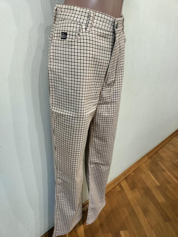 В идеальном состоянии брюки в клетку на девушку 48р. Длина штанины с поясом до низа 105см, длина с поясом до памперса 38см, талия 38см, беждра 50см, длина шага 73см, ширина низа штанины 20см. Ткань средней толщины-легкий стрейч.