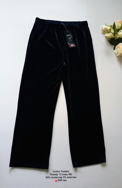 Брюки велюр от Cotton Traders. Размер 12 (наш 48). Состав: 95% полиэстер 5% эластан. Замеры: длина по боковому/внутренему шву 94/67 см, ПОТ 36 см резинка тянется до 50 см, ПОБ 52 см, высота посадки переда/спинки 28/31 см, ширина штанины в пахе 29 см, ширина штанины в колене 23 см, ширина штанины низа 23 см. Состояние новое с бирками.