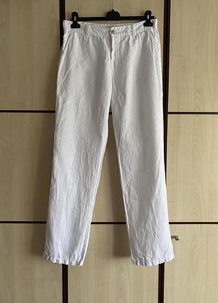 Мужские льнянык брюки из 100/ льна. На женщину тоже сядут хорошо. Длина 103, шаговый шов 76, по поясу 40, посадка впереди 28,5, сзади 31, по бедрам 58 в области пахового шва. Ширина штанины вверху 32, внизу 22 см