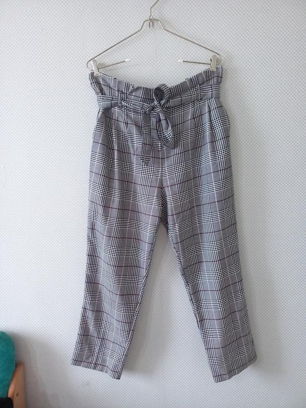 Женские брюки в "гусиную лапку". Имеют высокую талию, складки, карманы. Застегиваются на пуговицу и молнию, завязываются на поясок. Стан идеален. Размер по набору 16. Замеры: талия - 48см, бедра - 59см, длина по внешнему шву - 101см, длина по внутреннему - 67см, ширина штанины внизу - 19см.