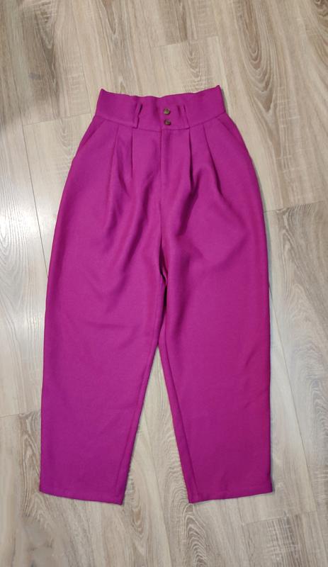 Яркие брюки с высокой посадкой и двойными защипами. В реальности цвет немного темнее. Гудзики золотого цвета с красивой гравировкой. Есть петельки для двух тоненьких поясов. Бирки со составом нет. Стан идеален. Заміри на фото.