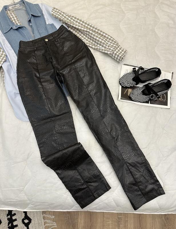 Чёрные кожаные брюки на высокой посадке с стеснением под питона. Внизу разрезы. Очень эффективно на фигуре. Замеры: посадка 28 см, талия 31 см, бедра 45 см, длина 109 см, по внутреннему шву 82 см.