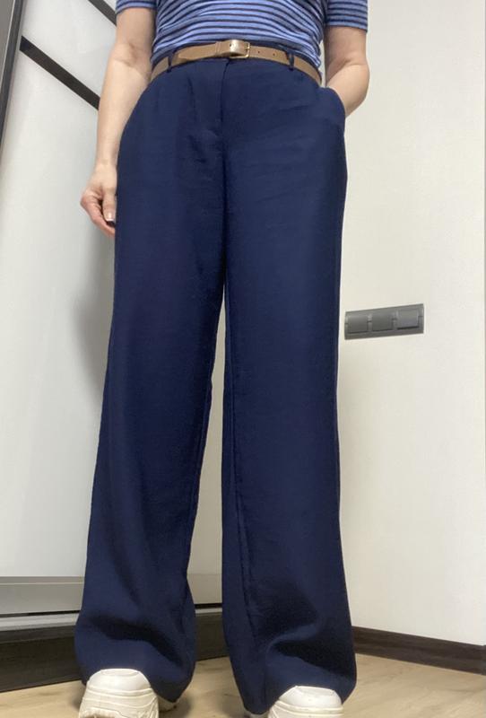 Лаконічні брюки Темно-сині Колір передають фото 1 та 2 Є бокові кишені Одягла на зріст 160 см та розмір М То краще на L Приємна тканина схожа на ліоцел/тенцел Всі заміри уважно по фото