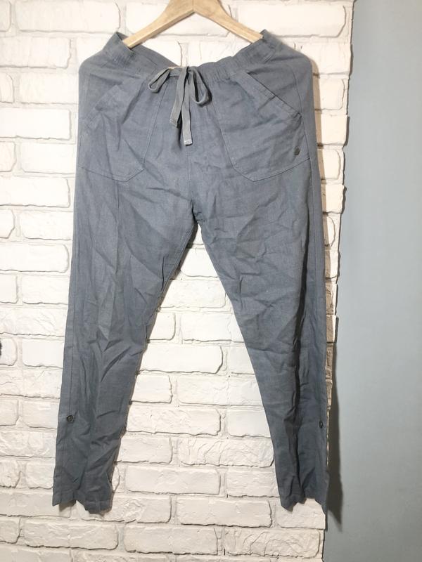Тонкие, летние, приятные, ниспадающие. С 2 карманами спереди, 2 сзади. Пояс на резинке + шнурки. Виз 33 до 42 см регулируются Длина 95 см 55% льон 45% вискоза - не слишком мнутся Цвет голубой серый