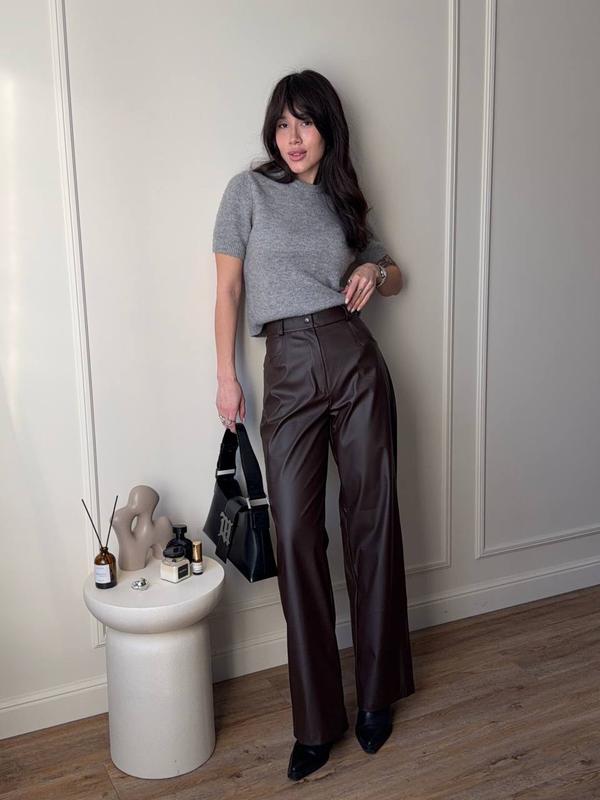 ✨Новинка ✨ фото реал ♥️ Модель : 147 мс Стильні штани з матової еко шкіри , вільного крою та високою посадкою Кишені робочі Колір : чорний , шоколад Розмір : S- M / M - L Тканина : матова еко шкіра ⬆️ 1080 грн