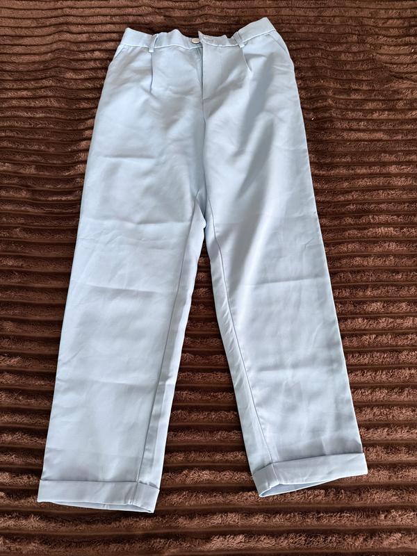Легкі брюки гарного блакитного кольору( на фото виглядають більш світліше) Прямого крою, на застібці, позаду на резинці Розмір XS, можна на S Ширина 36 см Довжина 91 см