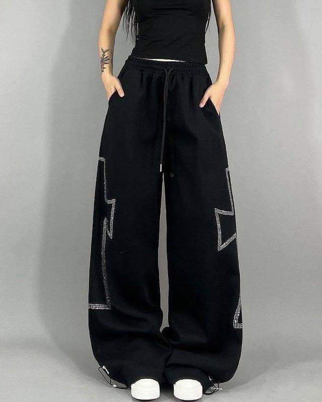 🆕💎Новинка 😎Штани 😎Мод. 2789 😎Тканина: двонитка 😎Размер: 42-48 (oversize) 😎Цвет: черный 😎Низ на затяжке 😎Качественный накат с камушками Добавь дерзости своему гардеробу! Эти брюки - идеальный микс комфортного оверсайза и готического шика. 📏Замеры: Ширина по линии талии от 30 до 50 см Обхват стегон до 120 см Длина по овн.шву 106 см Длина по внутреннему шву 75 см Ширина штанини 35 см