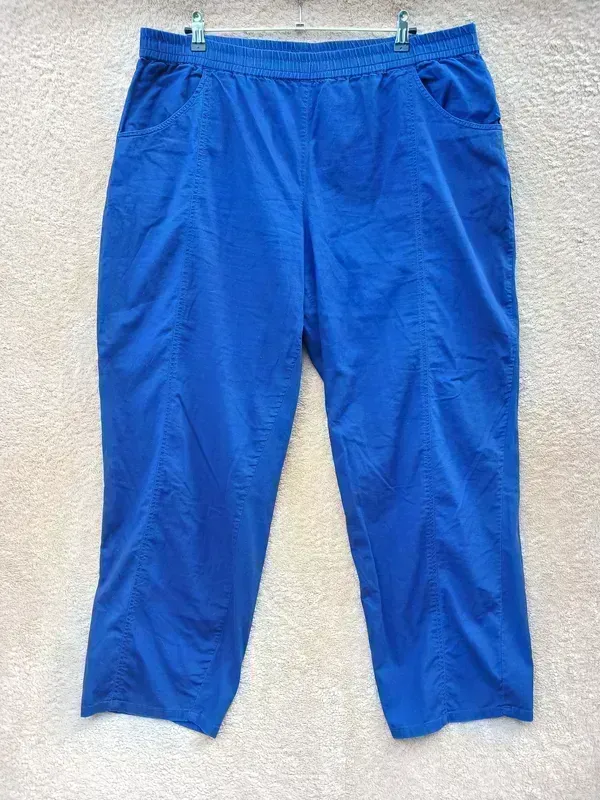 Синие брюки с карманами, хлопок, надо продеть и растянуть резинку, можно вставить другую, станы для дома или для дачи ПО пояс 51-55, ПО бедра 65, посадка 33/49, длина 104, ширина внизу 23 Замеры отличия половина