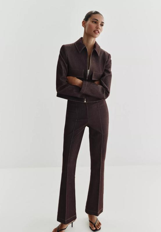 Брюки с высокой посадкой и расклешенным низом. Застежка спереди на молнию, внутренняя пуговица и крючок.