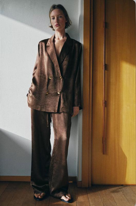 Брюки с высокой посадкой и эластичным поясом, регулируемым шнурком. Карманы спереди. Прямые штанины. Атласная ткань с жатым эффектом.
