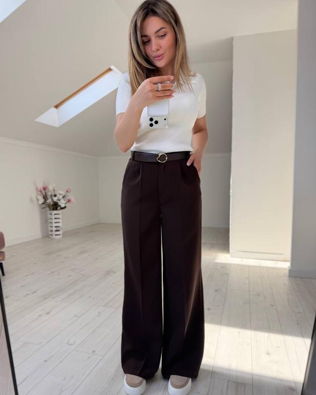 Фото окремо !!!! Штани Арт 18 Тканина костюмний креп Колір чорний, шоколадний, кремовий, рожевий Розмір 42,44,46,48,50,52 Ав871 Штани посадка середня, позаду талія на резинці, застібається на ґудзик та блискавку Пояс з екошкіри до комплекту не входить, можна придбати окремо -100 грн