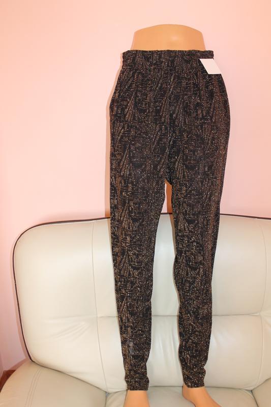 Класні штани з люрексовою ниткою кольору золота, розмір С вказано, на М теж підійдуть.Довжина по зовнішньому шву-104,5 см, внутрішня-76см, пояс-35см(тягнеться до 53см), побіди-55см,передня посадка-32см, задня - 45см.
